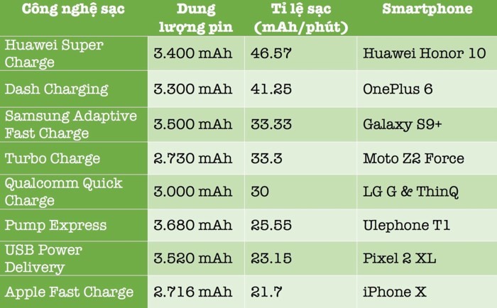 Kết quả thử nghiệm cho thấy, Huawei Honor 10 là chiếc smartphone có tốc độ sạc nhanh nhất hiện nay (công nghệ Huawei Super Charge) và nhanh hơn gấp đôi so với iPhone X (Apple Fast Charge). Vị trí thứ hai thuộc về OnePlus 6, Galaxy S9+, LG Thin Q, Pixel 2 XL…