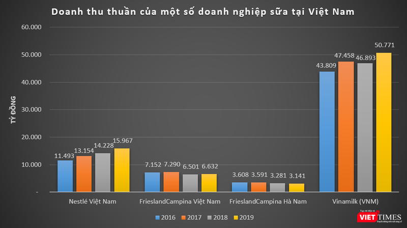 Kết quả này không quá bất ngờ khi dữ liệu của VietTimes cho thấy, 4 năm trở lại đây, doanh thu của Nestlé Việt Nam luôn đạt trên chục nghìn tỷ đồng mỗi năm, vượt trội hơn hẳn so với “đại đối thủ” FrieslandCampina Việt Nam.