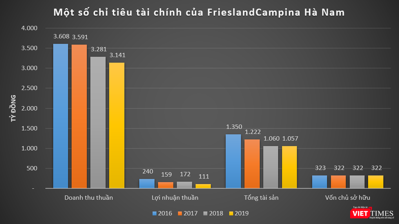 Tính đến 31/12/2019, tổng tài sản của FrieslandCampina Việt Nam đạt 2.611 tỉ đồng, tăng 6% so với thời điểm đầu năm; vốn chủ sở hữu giảm nhẹ từ 1.087 tỉ đồng xuống mức 1.055 tỉ đồng.