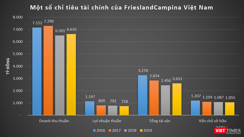 Năm 2019, doanh thu thuần của FrieslandCampina Việt Nam đạt 6.632 tỉ đồng, tăng 2% so với năm trước; lãi thuần ở mức 758 tỉ đồng, trong khi năm 2018 lãi 792 tỉ đồng.