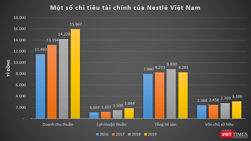 Cụ thể, năm 2016 và 2017, doanh thu thuần của Nestlé Việt Nam lần lượt đạt 11.493 tỉ đồng và 13.154 tỉ đồng, lãi thuần tương ứng ở mức 1.107 tỉ đồng và 1.197 tỉ đồng. Năm 2019, 2 chỉ tiêu trên lần lượt là 15.967 tỉ đồng và 1.844 tỉ đồng, tương ứng mức tăng trưởng 12% và 22% so với năm 2018.