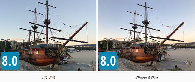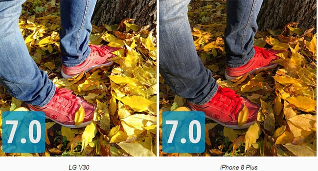 Màu sắc của các bức ảnh khá chính xác. Tuy nhiên V30 và Note 8 lại cho ra những bức ảnh kém hơn với một gam màu lạnh và xanh hơn. Đây không phải là trường hợp duy nhất bởi trước khi chụp những bức ảnh này, chúng tôi đã thử chụp một vài khung hình tương tự, và kết quả cũng không khác gì nhiều. HTC U11 cũng không giữ được tông màu, cho ra một hình ảnh hơi xanh. Camera của iPhone 8 Plus là chiếc camera cho ra một hình ảnh chân thực nhất.