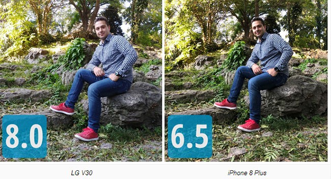 Thành thật mà nói, tôi khá hài lòng với bức ảnh được chụp từ LG V30, tất nhiên không phải vì đó là bức ảnh chụp tôi. Chắc chắn là bức ảnh đó còn một vài thiếu sót nhưng độ phơi sáng và đặc biệt là độ sáng ở khuôn mặt của tôi làm bức ảnh nổi bật hẳn lên. Galaxy Note 8 cũng xếp gần như ngang hàng với LG V30 bởi vì có ít bóng che mặt tôi, nền được phơi bày tốt hơn với nhiều điểm tương phản được lưu lại. Xếp hạng ngay sau V30 và Note 8 là HTC U11. Có lẽ bức ảnh được chụp từ U11 có sử dụng một chút tông ấm hơn. Đối với iPhone, chúng tôi hy vọng nó cho ra một hình ảnh tốt hơn, nhưng ngược lại, sự tương phản trong bức hình khá cao. Điều này làm cho người xem cảm thấy hình ảnh không được chân thực cho lắm.
