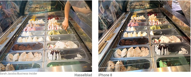 Tôi đi dạo đến Little Italy, kế bên Chinatown, để chụp các món tráng miệng trên phố đường ở đây. Hasselblad X1D bắt màu sắc chính xác của tất cả kem Gelato cũng như màu da trên canh tay đang múc kem trong hình. Còn iPhone 7 tự động mài sắc màu của hình ảnh, điều đó khiến kem Gelato kém hấp dẫn và không còn tạo cảm giác thêm ăn như lúc đầu.