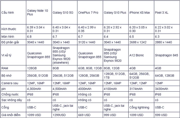 Về độ phân giải, Note 10 Plus, S10 5G và S10 Plus đều có màn hình AMOLED với độ phân giải 3040 x 1440, trong khi màn hình AMOLED của OnePlus 7 Pro có độ phân giải 3120 x 1440. Note 10 Plus thậm chí còn bao gồm cảm biến thời gian bay (còn được gọi là cảm biến giúp đo độ sâu trường ảnh). Và bạn có thời lượng pin dài hơn, từ pin 3.174 mAh có trong iPhone XS Max đến pin 4.500mAh nằm trong Galaxy S10 5G.