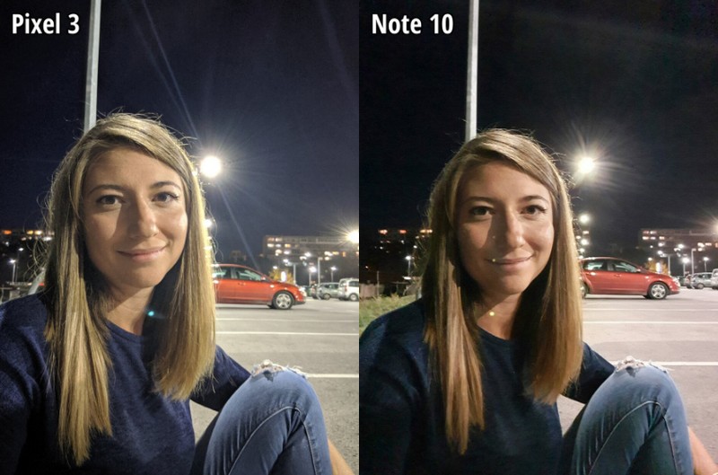 Tấm ảnh chụp từ Note 10 không đẹp bằng Pixel 3 nhưng chắc chắn đẹp hơn iPhone. Ảnh từ máy Samsung chụp cũng bị nhiều nhiễu trên khuôn mặt người mẫu như iPhone, nhưng Samsung đã dùng thuật toán xóa khá triệt để. Kết quả là, khuôn mặt người mẫu không hề nét, nhưng ở mức khá xét trên phương diện hình ảnh. Các chi tiết tổng thể trên ảnh không bằng Pixel 3 nhưng chúng vẫn ổn. Màu sắc và phơi sáng cũng chấp nhận được.