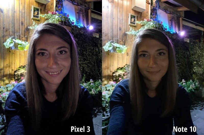 Ảnh của Galaxy Note 10 đã xử lý tốt hơn ở phần vai trái của người mẫu, nhưng dải màu động hơi hẹp khiến cho phần tóc của người mẫu ngả đen. Nhìn chung, màu sắc của ảnh không chân thực bằng ảnh chụp từ Pixel 3.