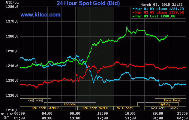Chốt phiên giao dịch Thứ Năm (ngày 03/03), giá vàng giao tháng Tư trên sàn Comex tại Sở giao dịch New York Mercantile tiếp tục leo cao $16,40 (+1,3%) lên đóng cửa ở $1.258,20/oz, đoạt đỉnh kể từ ngày 05/02/2015, theo số liệu của Dow Jones. Tính tổng cộng từ đầu tuần, vàng đã leo giá tổng cộng 3%.
