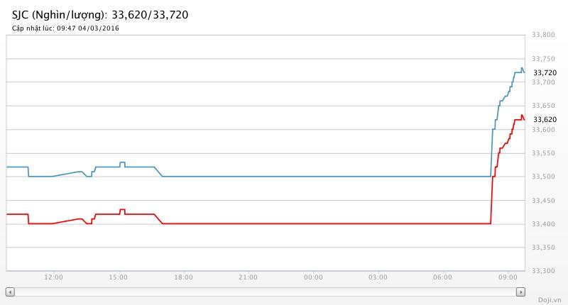 Tính đến thời 9h40’ sáng, Công ty TNHH Một thành viên Vàng bạc đá quý Sài Gòn (SJC) đang yết giá vàng miếng SJC ở 33,53 - 33,83 triệu đồng/lượng (MV-BR), tăng sốc 220 nghìn đồng so với chốt phiên trước đó.