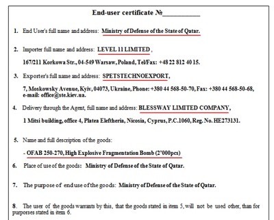 Không quân Qatar sử dụng chiến đấu cơ đa nhiệm Mirage do Pháp sản xuất và máy bay chiến đấu tấn công hạng nhẹ Alpha. Không có loại máy bay nào có thể lắp bom OFAB 250-270. Vậy câu hỏi ở đây là: Tại sao Bộ Quốc phòng Qatar lại muốn mua một số lượng bom khổng lồ của Ukraine, trong khi chúng không thích dụng với các máy bay của họ, với giá cao gấp 3 lần thị trường? (giá bình thường của bom OFAB 250-270 chỉ vào khoảng 700-800 USD/quả).