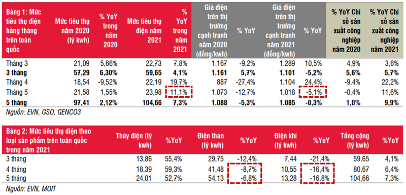 Tháng 5/2021, tổng sản lượng điện tiêu thụ trên toàn quốc tiếp tục tăng 11,1% so với cùng kỳ năm 2020, đạt 23,98 tỉ kwh. Tuy nhiên, giá bình quân trên thị trường cạnh tranh (giá CGM) lại giảm 5,1% so với cùng kỳ năm ngoái, xuống còn 1.018 đồng/kwh - phần lớn do giảm huy động từ các nhà máy nhiệt điện, đặc biệt là các nhà máy điện khí.