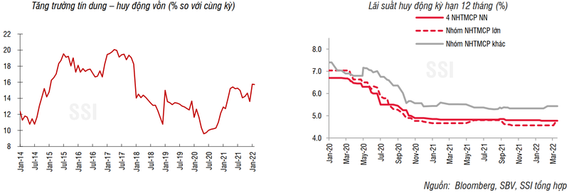 Theo SSI, sự phục hồi mạnh mẽ của tín dụng trong giai đoạn đầu năm 2022 phản ánh nhu cầu tín dụng tăng dần của doanh nghiệp sau khi bị gián đoạn do dịch bệnh. Kết quả này còn đến từ nỗ lực hỗ trợ bơm vốn giá rẻ của hệ thống ngân hàng thông qua các chương trình cho vay ưu đãi.