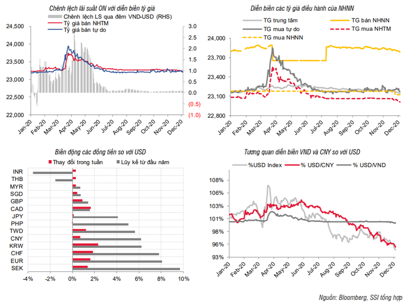 Tất cả các đồng tiền đều ghi nhận một tuần tăng giá so với USD: KWR (tăng 2,33%), CHF (tăng 1,84%), EUR (tăng 1,63%), GBP (tăng 0,89%), CNY (tăng 0,72%), … Tính từ đầu năm đến nay, chỉ số DXY đã giảm khoảng 6%, xu hướng giảm của đồng USD có thể sẽ tiếp diễn trong năm 2021 nếu Cục dự trữ Liên bang Mỹ (FED) tiếp tục duy trì chính sách nới lỏng.