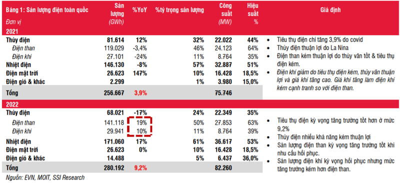 SSI Research cho rằng, tình hình thủy văn nhiều khả năng kém thuận lợi trong năm 2022 và sẽ làm tăng nhu cầu tiêu thụ nhiệt điện. Tuy nhiên, sẽ có sự khác biệt về tăng trưởng lợi nhuận giữa nhóm công ty điện than và công ty điện khí.