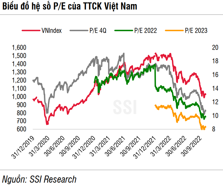 Theo thống kê của SSI Research, TTCK Việt Nam với đại diện là chỉ số VN-Index đã giảm 31,3% điểm số kể từ đầu năm 2022 và mức giảm của hệ số P/E ước tính năm 2022 của chỉ số VN-Index cũng tương đương ở mức 31,4%.