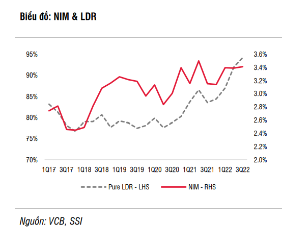 Dù đánh giá thanh khoản của Vietcombank vẫn 'tương đối tốt', SSI cho rằng lãi suất huy động của nhà băng này vẫn có thể tiếp tục tăng dưới áp lực cạnh tranh. Đặc biệt là khi ngân hàng này đặt mục tiêu tăng trưởng tiền gửi là 8% cho năm 2022, trong khi mức tăng hiện tại mới chỉ là 5% so với đầu năm.