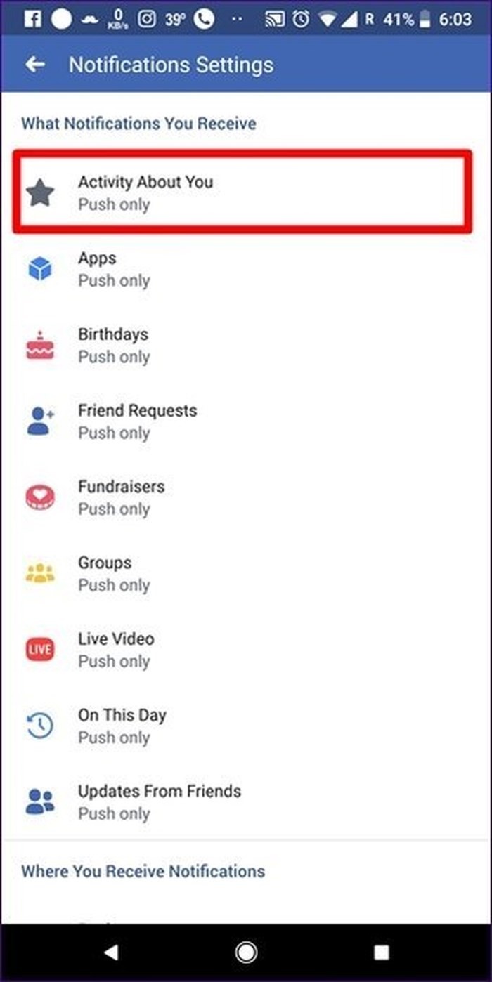 Tại đây, bạn xem được Facebook có thể gửi thông báo loại nào. Bấm vào Activity about you, kiểm tra xem Push có được bật không.