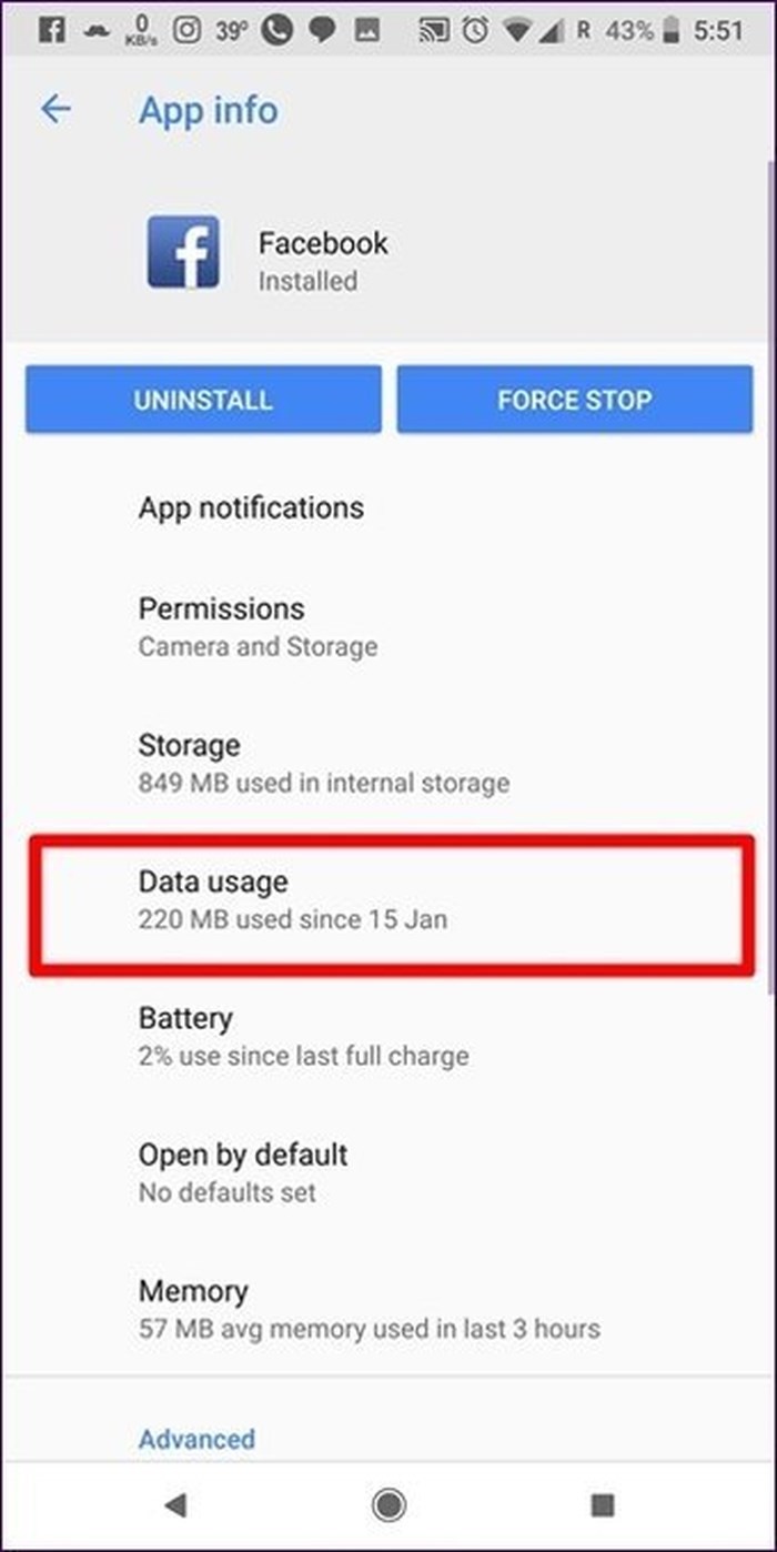 Một cài đặt khác bạn cần biết đó là giới hạn dữ liệu. Khi được kích hoạt, ứng dụng sẽ không đồng bộ dữ liệu trong nền, khiến cho không có thông báo đẩy. Vào Apps bên trong mục Settings của điện thoại bấm vào Facebook > Data usage. Tìm tùy chọn Background data và bật lên.