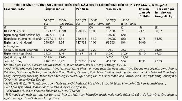 Theo số liệu của NHNN, tổng tài sản có toàn hệ thống tổ chức tín dụng tăng từ 6.865.068 tỉ đồng vào cuối tháng 10-2015 đến 7.021.019 tỉ đồng vào cuối tháng 11. Trong đó, tổng tài sản tăng mạnh nhất thuộc nhóm ngân hàng quốc doanh, tăng 11,98% so với cuối năm 2014, trong khi nhóm ngân hàng cổ phần chỉ cải thiện nhẹ, tăng 3,31%.