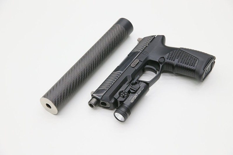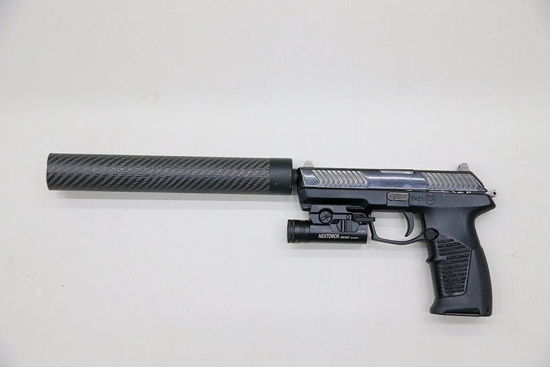 Nhà mỹ thuật công nghiệp Vladimir Pirozhkov với súng ngắn Udar gắn nòng giảm thanh. Ảnh: RIA Novosti.