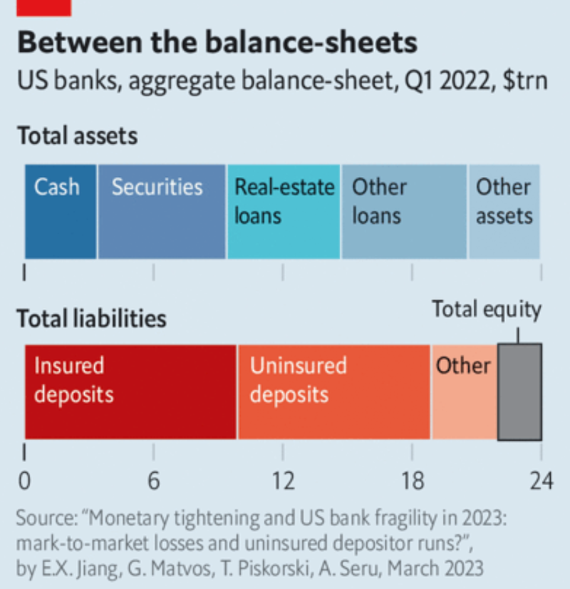 Đầu năm 2022, khi lãi suất ở gần mức 0%, các nhà băng Mỹ nắm giữ khối tài sản trị giá 24.000 tỉ USD. Trong đó, 3.400 tỉ USD là tiền mặt, dùng để đáp ứng nhu cầu rút tiền của khách hàng. Khoảng 6.000 tỉ USD là chứng khoán, chủ yếu là trái phiếu kho bạc hoặc trái phiếu đảm bảo bằng thế chấp. Dư nợ cho vay ở mức 11.200 tỉ USD.