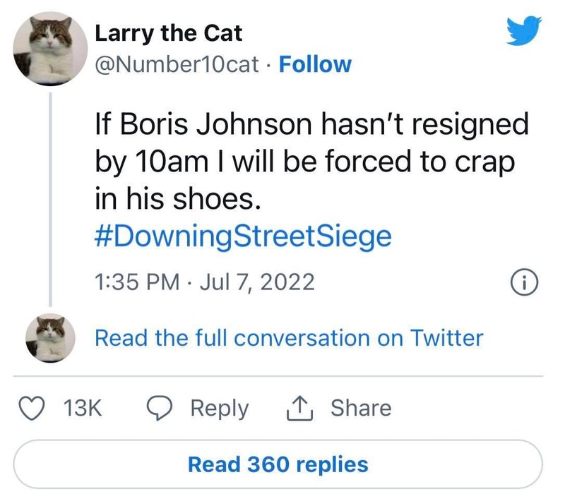 Trong một loạt đoạn tweet mà mèo Larry đã “đăng tải,” chú mô tả việc ông Johnson từ chối từ chức là “trò chơi đố chữ,” và đe dọa sẽ “cào nát đôi giày của ông ta” nếu như “Boris Johnson chưa chịu từ chức vào 10h00” ngày 7/7 (theo giờ Anh).