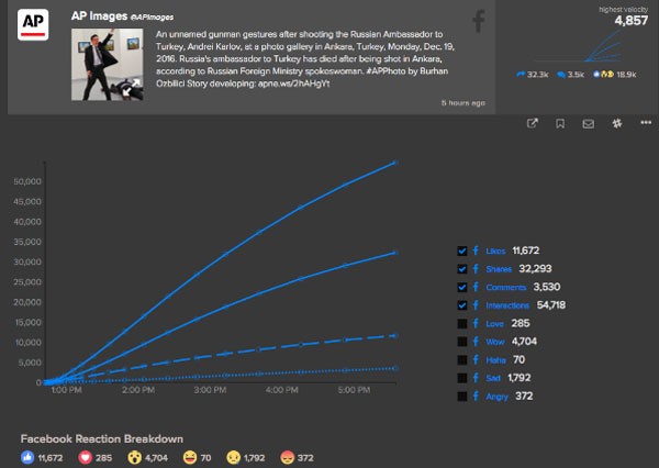 Một đại diện của NewsWhip, dịch vụ phân tích dữ liệu chuyên theo dõi các nội dung có sự lan truyền mạnh mẽ, cho biết bức ảnh đã mang đến 175 lần tương tác trung bình cho trang AP Images. Công ty cũng đã cung cấp biểu đồ cho thấy sự lan truyền nhanh chóng của bức ảnh đến mức nào – rất nhiều lượt like, share, bình luận và click vào Facebook.