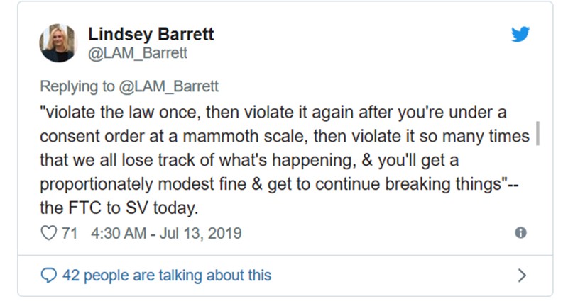 Còn chưởng lý vùng Georgetown, bà Lindsey Barrett thì nói rằng: “Facebook vi phạm một lần, sau đó một lần nữa ở quy mô lớn, rồi họ vi phạm nhiều lần đến nỗi chúng ta không thể theo kịp những gì xảy ra. Họ nhận được một khoản tiền phạt tương đối khiêm tốn và tiếp tục phá vỡ mọi thứ”.