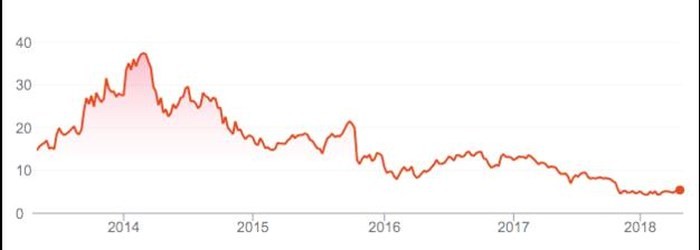 Để thấy rõ hơn điều này dưới góc độ nhà đầu tư, hãy nhìn vào mức giá cổ phiếu của Pandora - người anh họ lớn tuổi của Spotify trong vòng 5 năm qua: