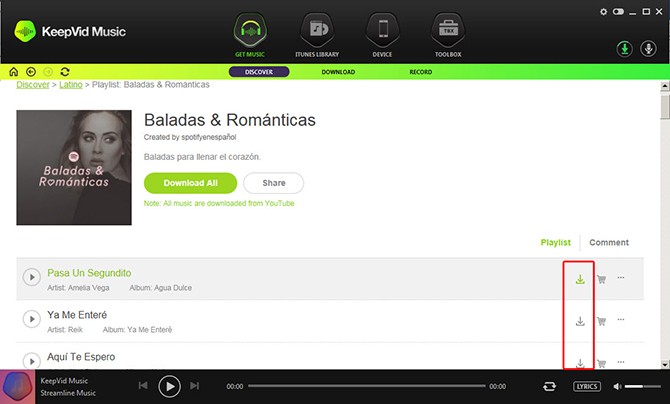 Trên giao diện chính, bạn chọn Get Music/Record. Bấm vào nút Record màu đỏ phía dưới để KeepVid Music sẵn sàng thu âm nhạc. Bây giờ bạn cần chơi bản nhạc trực tuyến trên Spotify hoặc các dịch vụ Stream nhạc khác mà bạn muốn ghi lại. Chương trình sẽ tự động phát hiện nhạc và bắt đầu thu âm bài hát. Các bản thu âm được tìm thấy ở iTunes Library/Recorded.