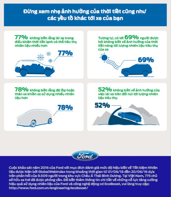 Mặc dù người dùng Việt Nam đã bắt đầu chú ý hơn tới việc mua những chiếc xe tiêu thụ ít nhiên liệu để tiết kiệm tiền cho họ, cách tốt nhất để làm điều này vẫn là xây dựng thói quen lái xe đúng cách (và điều này hoàn toàn miễn phí!). Khảo sát về lái xe tiết kiệm nhiên liệu được Công ty Ford Motor thực hiện trên 9,500 người sử dụng xe trên 11 thị trường tại khu vực Châu Á – Thái Bình Dương, trong đó có 774 người tham gia đến từ Việt Nam.