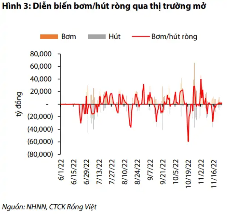 Theo các chuyên gia tại VDSC, từ đầu tháng 11 đến 25/11, NHNN đã bơm ròng qua thị trường mở khoảng 23.288 tỉ đồng, thấp hơn đáng kể lượng bơm ròng 50.381 tỉ đồng trong tháng 10/2022.