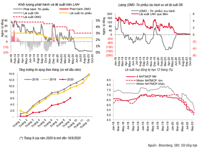 NHNN dự kiến tăng trưởng tín dụng cả năm 2020 có thể đạt từ 8-10%, tức là có khoảng 150-320 nghìn tỷ đồng tín dụng tăng thêm trong Quý 4 năm nay. Tuy nhiên, SSI cho rằng, tăng trưởng tín dụng ở các NHTM lớn vẫn kém khả quan, lãi suất tiền gửi vẫn sẽ chịu áp lực giảm thêm từ 0,1-0,3%/năm trong quý cuối năm.