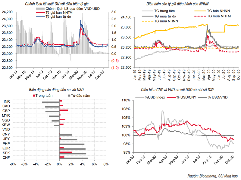 Chỉ số DXY quay đầu giảm từ mức 94,6 xuống 93,8, hầu hết các đồng tiền tăng giá nhẹ so với USD trong tuần qua như: EUR (tăng 0,73%), GBP (tăng 1,48%), JPY (tăng 0,27%), SEK (tăng 2,11%), CHF (tăng 0,83%)… Đồng CNY chốt tháng 9 ở mức 6.791 CNY/USD, tăng 0,8% so với cuối tháng 8.