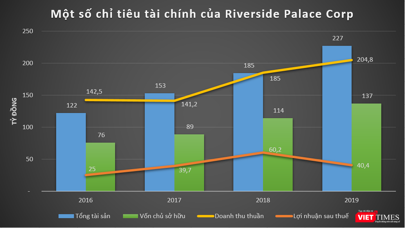 Sang năm 2019, doanh thu thuần của Riverside Palace Corp đạt 204 tỷ đồng, tăng 10% so với năm 2018; nhưng lợi nhuận sau thuế lại giảm 33% về mức 40,4 tỷ đồng.