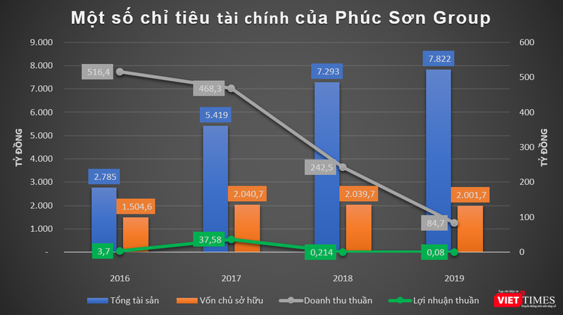 Theo đó, tính đến cuối năm 2019, tổng tài sản của Phúc Sơn đạt 7.822 tỷ đồng, gấp 2,8 lần so với thời điểm cuối năm 2016; trong khi vốn chủ sở hữu chỉ tăng nhẹ từ 1.504,6 tỷ đồng lên đạt 2.001,7 tỷ đồng.