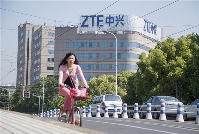 Logo Tập đoàn viễn thông ZTE của Trung Quốc trên một tòa văn phòng ở thành phố Thượng Hải. (Nguồn: AFP/TTXVN)
