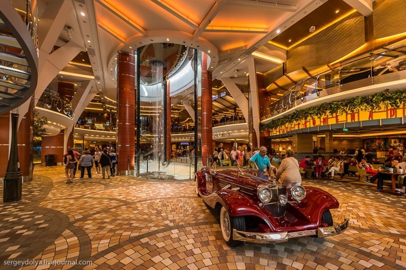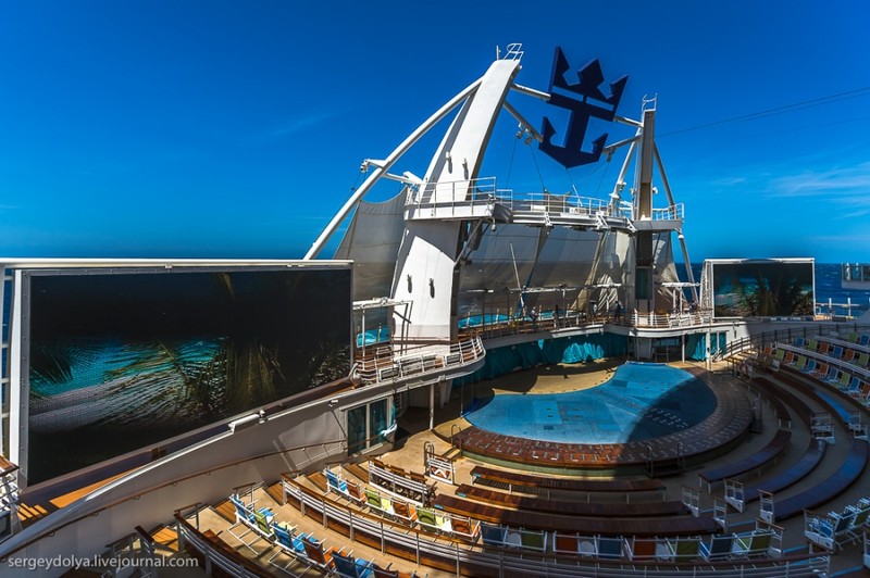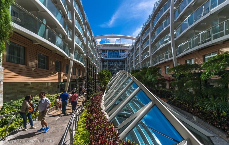 Tàu du lịch là hai khách sạn song song với nhau, kết nối bằng những kết cấu, ở giữa là không gian xanh. Phía trên là khu vực bể bơi, ghế nằm phơi nắng.