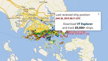 Vị trí tàu Rolldock Star lúc 18 giờ 45 ngày 8/1, khi qua mũi Hảo Vọng và trưa ngày 26/1, khi rời Singapore về Cam Ranh. Ảnh: Báo Tiền Phong