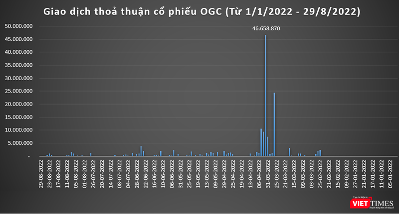 Thống kê của VietTimes cho thấy, từ ngày 4/1 - 29/8/2022, 155,9 triệu cổ phiếu OGC của CTCP Tập đoàn Đại Dương đã được trao tay qua phương thức thoả thuận. Đó thực sự là một con số đáng chú ý, nếu so với thống kê tương ứng cho cả năm 2021: 44 triệu đơn vị.