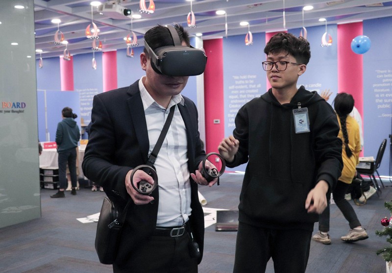 Một bạn trẻ trải nghiệm công nghệ thực tế ảo tại triển lãm