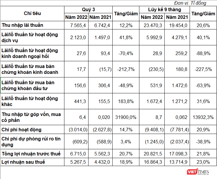 Ngân hàng TMCP Kỹ thương Việt Nam (Techcombank – Mã CK: TCB) vừa công bố kết quả kinh doanh quý 3/2022 với lợi nhuận trước thuế đạt 6.715 tỉ đồng, tăng 20,7% so với cùng kỳ năm ngoái.