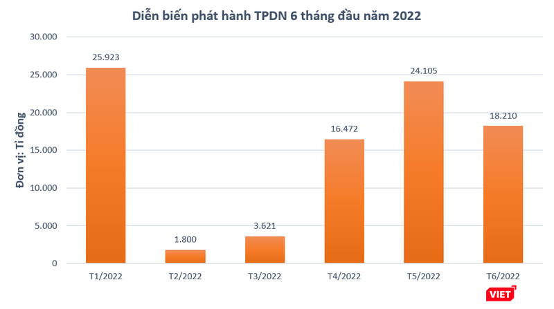 Theo Hiệp hội thị trường trái phiếu Việt Nam (VBMA), trong tháng 6/2022, có 26 đợt phát hành trái phiếu doanh nghiệp riêng lẻ với giá trị đạt 18.210 tỉ đồng và 1 đợt phát hành trái phiếu quốc tế trị giá 100 triệu USD của CTCP Vingroup.