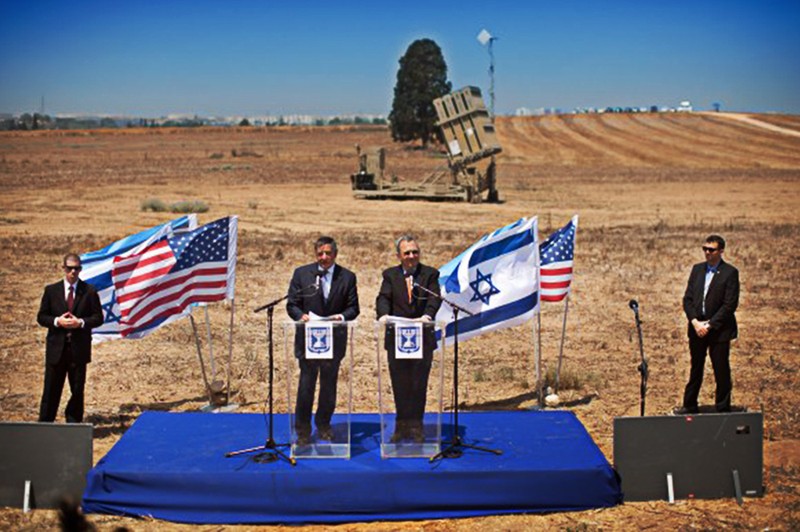 Bộ trưởng Quốc phòng Israel Ehud Barak và Bộ trưởng Quốc phòng Mỹ Leon Panetta tại cuộc họp báo chung khi thăm hệ thống Iron Dome vào ngày 01.08.2012 ở Ashkelon, Israel. Hệ thống Iron Dome được thiết kế để đánh chặn và phá hủy tên lửa phi điều khiển tầm gần.