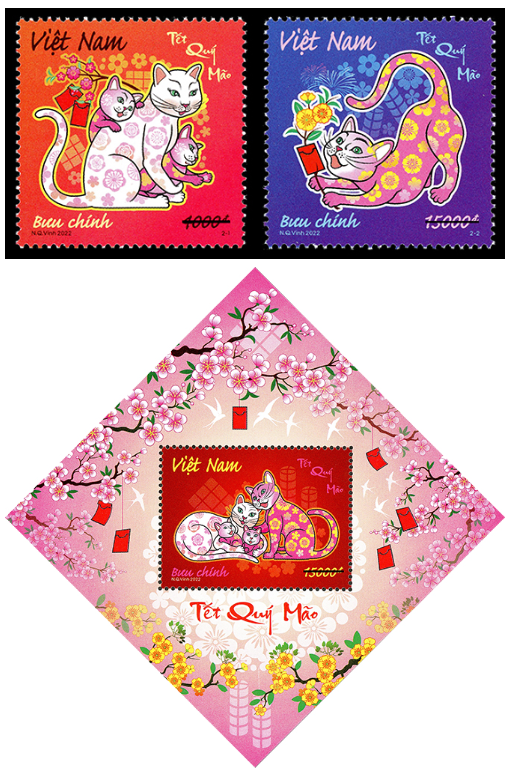 Năm nay, Bộ tem “Tết Quý Mão” gồm 2 mẫu tem và 1 blốc, được phát hành vào ngày 1/12/2022, do họa sĩ Nguyễn Quang Vinh thiết kế. Các chú mèo trong hai mẫu tem được sắp xếp đối xứng, hướng vào nhau như mong ước về đoàn viên, sum vầy ngày Tết được thể hiện trên mẫu blốc tem.