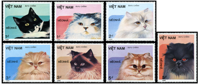 Mèo nhà cũng có 3 bộ khá đa dạng và phong phú về chủng loại. Năm 1986, Bưu chính Việt Nam phát hành bộ mã số 493 có 7 mẫu, chủ yếu giới thiệu đầu và mặt các loại mèo phổ biến, hình vẽ đẹp, mềm mại, nêu được nét đặc sắc của mỗi loài, đặc biệt có một con mèo mắt đỏ khá hiếm. 2 bộ còn lại vẽ toàn thân mèo.