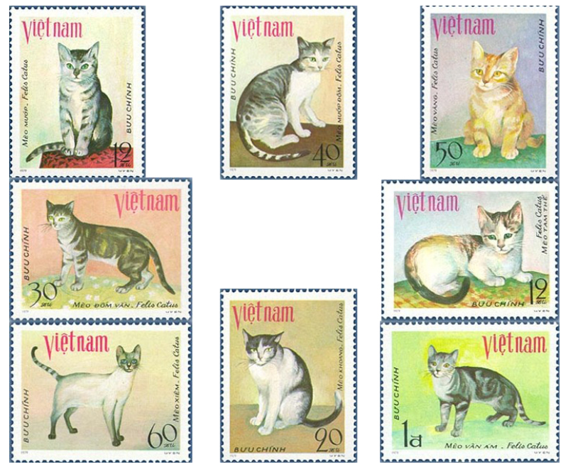 Bộ mã số 356 năm 1979 gồm 8 mẫu do họa sĩ Trần Ngọc Uyển thiết kế, giới thiệu các giống mèo mướp, tam thể, mèo khoang, mèo đốm vần, mèo mướp đốm, mèo vàng, mèo xiêm và mèo vân ám.