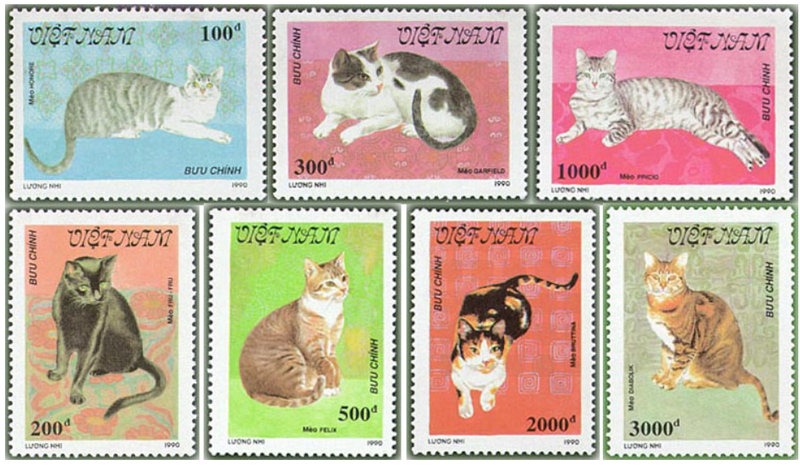 Theo danh mục tem bưu chính Việt Nam, có khá nhiều mẫu tem về mèo, gồm 2 loại chính là mèo rừng và mèo nhà.