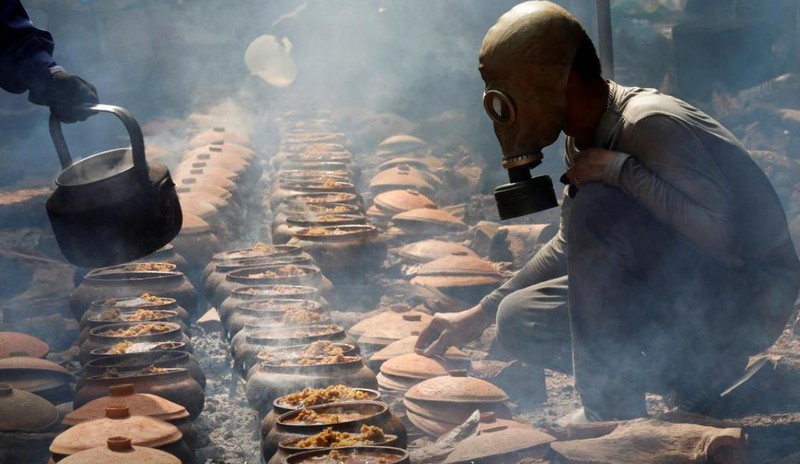 Với chiếc mặt nạ phòng độc, anh Bùi Văn Cường ngồi chăm chú canh lửa cho hàng trăm chiếc niêu đựng cá kho - một món ngon truyền thống phổ biến ở miền Bắc Việt Nam trong dịp Tết Nguyên đán.