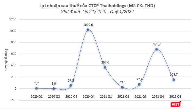 CTCP Thaiholdings (Mã CK: THD) vừa công bố kết quả kinh doanh quý 1/2022 với doanh thu thuần đạt 1.452,5 tỉ đồng, tăng 33,7% so với cùng kỳ năm trước. Tuy nhiên, lợi nhuận sau thuế hợp nhất chỉ đạt 158,7 tỉ đồng, giảm 56,8% so với cùng kỳ năm 2021.